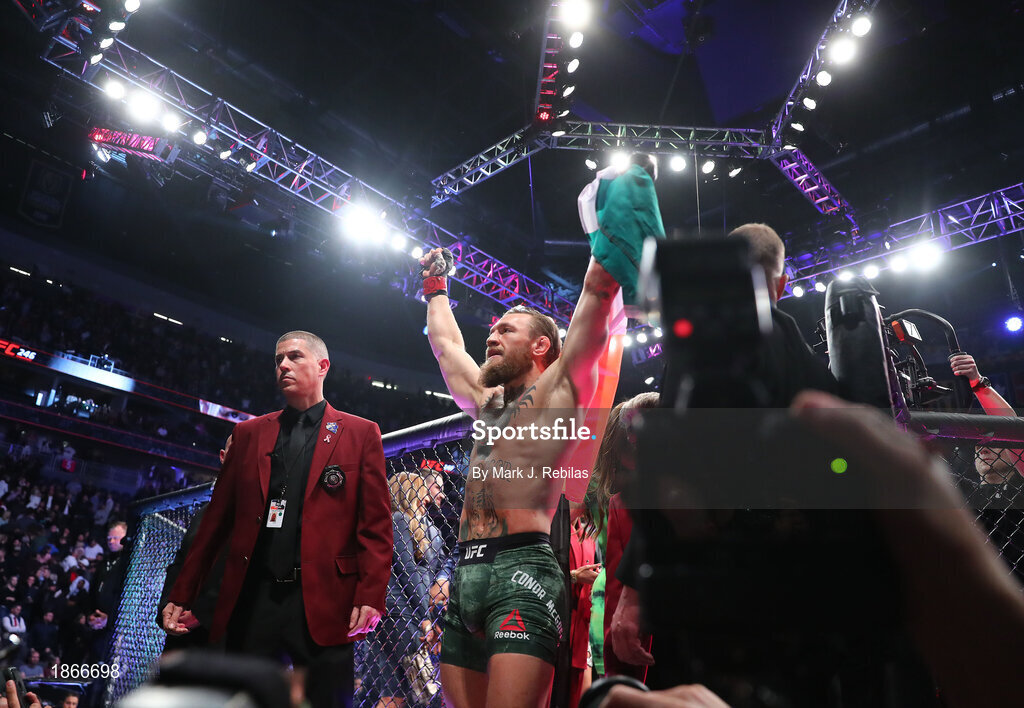 18 January 2020; Conor McGregor celebrates following his UFC 246 Welterweight bout with Donald Cerrone at the T-Mobile Arena in Las Vegas, Nevada, USA. Photo by Mark J. Rebilas / USA TODAY Sports via Sportsfile