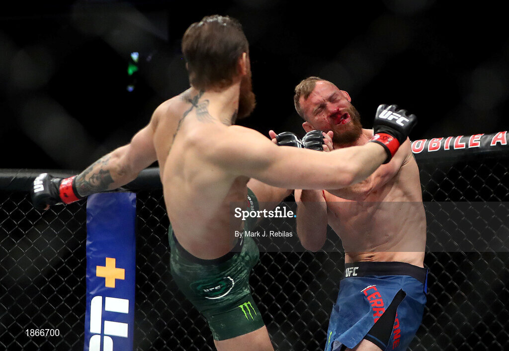 18 January 2020; Conor McGregor lands a kick on Donald Cerrone during their UFC 246 Welterweight bout at the T-Mobile Arena in Las Vegas, Nevada, USA. Photo by Mark J. Rebilas / USA TODAY Sports via Sportsfile