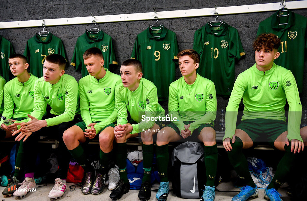 20 January 2020; Republic of Ireland players, from left, Adam Murphy, Conor Walsh, Joe O’Brien Whitmarsh, Liam Murray, Pearse O'Brien and Kevin Zefi during a briefing prior to the International Friendly match between Republic of Ireland U15 and Australia U17 at FAI National Training Centre in Abbotstown, Dublin. Photo by Seb Daly/Sportsfile