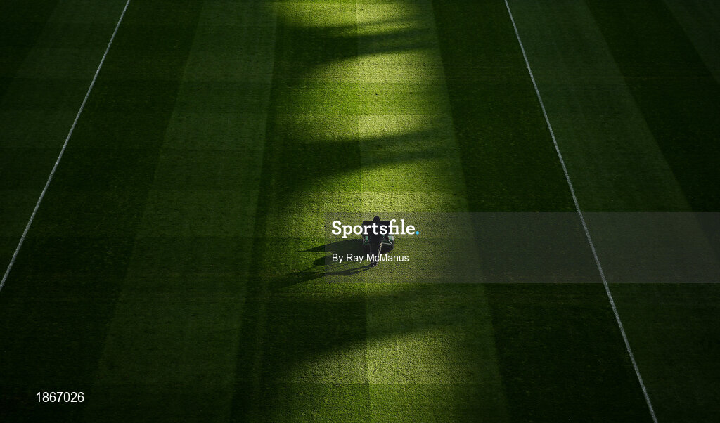 19 January 2020; A member of the Croke Park groundstaff cuts the grass in advance of the AIB GAA Football All-Ireland Senior Club Championship Final between Corofin and Kilcoo at Croke Park in Dublin. Photo by Ray McManus/Sportsfile