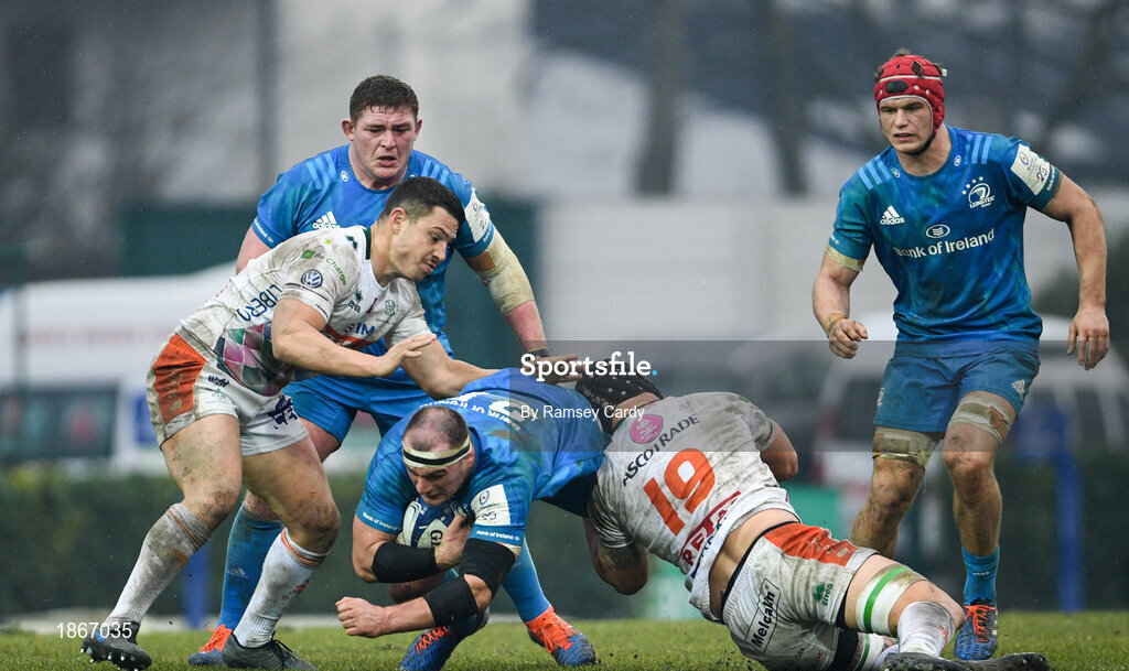 18 January 2020; Rhys Ruddock of Leinster is tackled by Ira Herbst of Benetton during the Heineken Champions Cup Pool 1 Round 6 match between Benetton and Leinster at the Stadio Comunale di Monigo in Treviso, Italy. Photo by Ramsey Cardy/Sportsfile