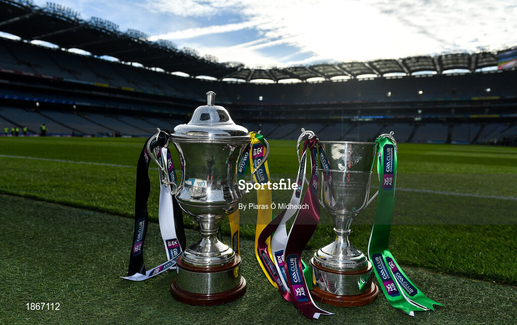 19 January 2020; A general view of the Andy Merrigan Cup, left, and the Tommy Moore Cup before the AIB GAA Football All-Ireland Senior Club Championship Final between Corofin and Kilcoo at Croke Park in Dublin. Photo by Piaras Ó Mídheach/Sportsfile