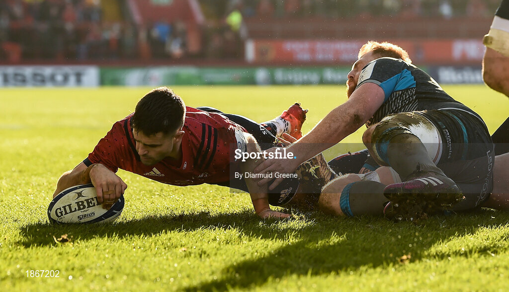 19 January 2020; Conor Murray of Munster scores his side's third try despite the efforts of Dan Baker of Ospreys during the Heineken Champions Cup Pool 4 Round 6 match between Munster and Ospreys at Thomond Park in Limerick. Photo by Diarmuid Greene/Sportsfile