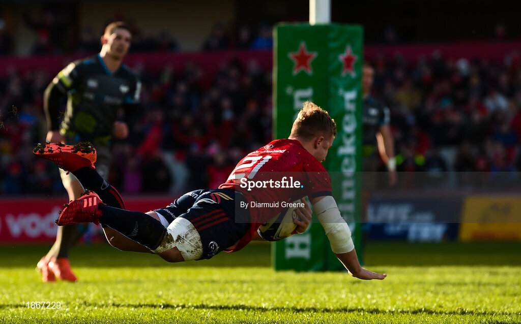 19 January 2020; Craig Casey of Munster scores his side's fourth try during the Heineken Champions Cup Pool 4 Round 6 match between Munster and Ospreys at Thomond Park in Limerick. Photo by Diarmuid Greene/Sportsfile