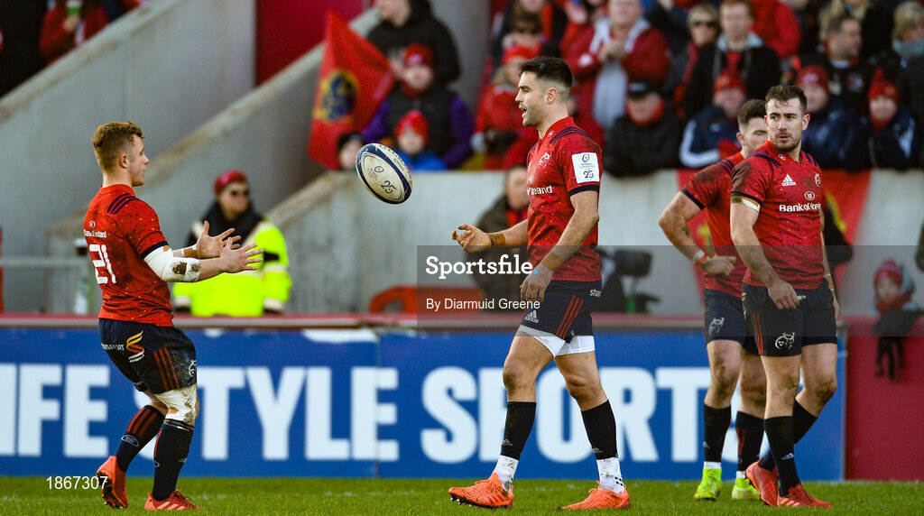 19 January 2020; Conor Murray of Munster passes the ball to team-mate Craig Casey as he comes on to replace him during the Heineken Champions Cup Pool 4 Round 6 match between Munster and Ospreys at Thomond Park in Limerick. Photo by Diarmuid Greene/Sportsfile