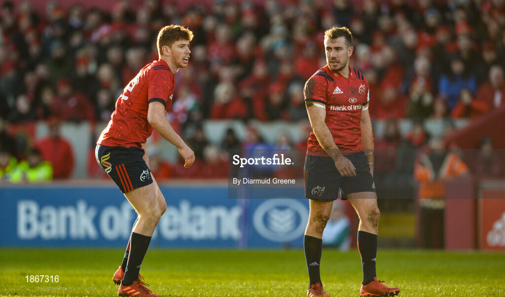 19 January 2020; Ben Healy and JJ Hanrahan of Munster during the Heineken Champions Cup Pool 4 Round 6 match between Munster and Ospreys at Thomond Park in Limerick. Photo by Diarmuid Greene/Sportsfile