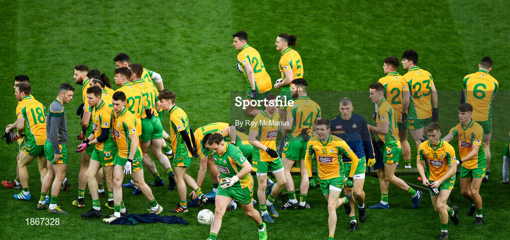19 January 2020; Corofin players make their way to the warm up routine after the traditionall team picture before the AIB GAA Football All-Ireland Senior Club Championship Final between Corofin and Kilcoo at Croke Park in Dublin. Photo by Ray McManus/Sportsfile