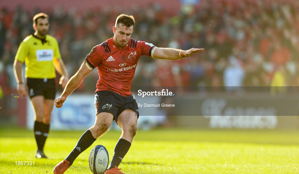 19 January 2020; JJ Hanrahan of Munster kicks a conversion during the Heineken Champions Cup Pool 4 Round 6 match between Munster and Ospreys at Thomond Park in Limerick. Photo by Diarmuid Greene/Sportsfile
