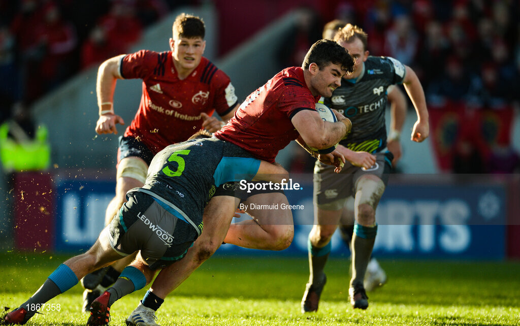 19 January 2020; Sam Arnold of Munster is tackled by Cai Evans during the Heineken Champions Cup Pool 4 Round 6 match between Munster and Ospreys at Thomond Park in Limerick. Photo by Diarmuid Greene/Sportsfile
