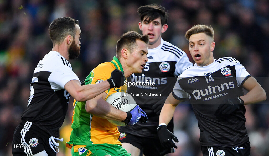 19 January 2020; Liam Silke of Corofin in action against Kilcoo players, from left, Conor Laverty, Eugene Branagan, and Jerome Johnston during the AIB GAA Football All-Ireland Senior Club Championship Final between Corofin and Kilcoo at Croke Park in Dublin. Photo by Piaras Ó Mídheach/Sportsfile