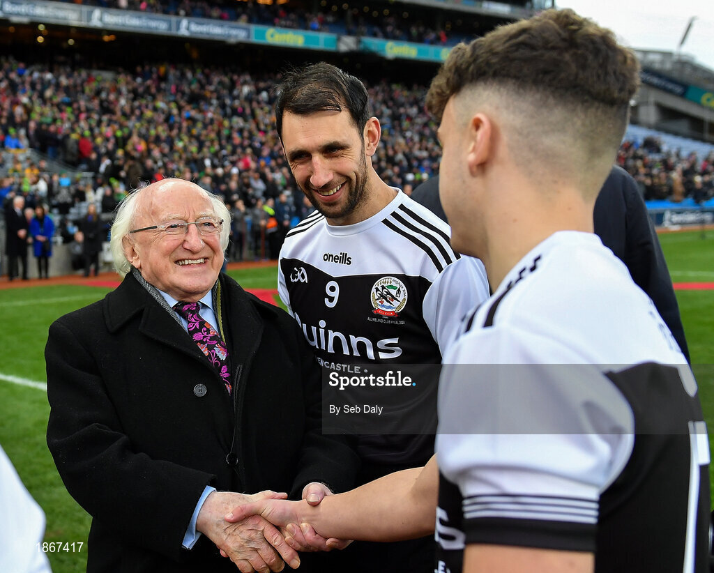 19 January 2020; President of Ireland Michael D Higgins is introduced to Kilcoo players by their captain Aidan Branagan prior to the AIB GAA Football All-Ireland Senior Club Championship Final between Corofin and Kilcoo at Croke Park in Dublin. Photo by Seb Daly/Sportsfile