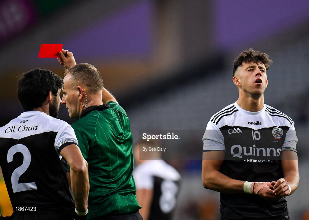 19 January 2020; Dylan Ward of Kilcoo reacts after being shown a red card by referee Conor Lane during the AIB GAA Football All-Ireland Senior Club Championship Final between Corofin and Kilcoo at Croke Park in Dublin. Photo by Seb Daly/Sportsfile