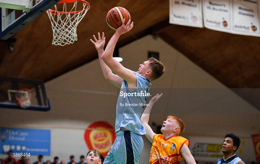 21 January 2020; Ruairi Cronin of Castletroy College in action against Drew Heatley Ryan of Coláiste Cholmcille during the Basketball Ireland U16 B Boys Schools Cup Final match between Coláiste Cholmcille, Ballyshannon and Castletroy College at the National Basketball Arena in Tallaght, Dublin. Photo by Brendan Moran/Sportsfile