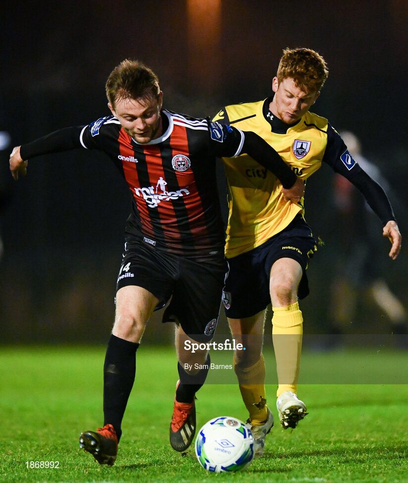 21 January 2020; Conor Levingston of Bohemians in action against Aaron McCabe of Longford Town during the Pre-Season Friendly match between Bohemians and Longford Town at AUL Complex in Clonsaugh, Dublin. Photo by Sam Barnes/Sportsfile