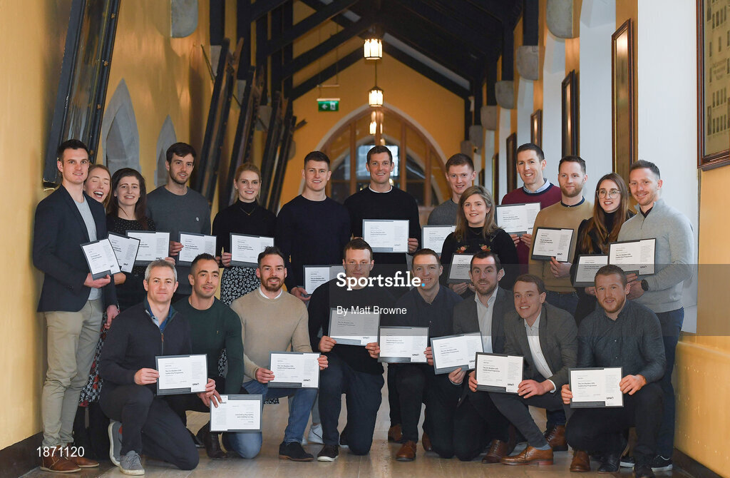 24 January 2020; Attendees, back row, from left to right, Eoin Doyle of Kildare, Maria Kinsella of Carlow, Fiona Keating of Westmeath, Jamie O'Sullivan of Cork, Niamh Mulcahy of Limerick, James Madden of Dublin, Seamus Callanan of Tiperrary, John Meagher of Tipperary, Laurie Ryan of Clare, Gary Brennan of Clare, Paddy Stapleton of Tipperary, Caoimhe Keoghan of Kildare and Paul Callinhane of Laois. Front row, from left to right, Ciaran Deely of Wexford/London, Nial Ewing of Sligo, Niall Kilroy of Roscommon, Paul Kileen of Galway, John Gaffey of Westmeath, James Clancy of Leitrim, Cillian Egan of Roscommon and Sean Ryan of Offaly in attendance at the Jim Madden GPA Leadership Programme Graduation for 2019 at NUI Maynooth in Maynooth, Co Kildare. Photo by Matt Browne/Sportsfile