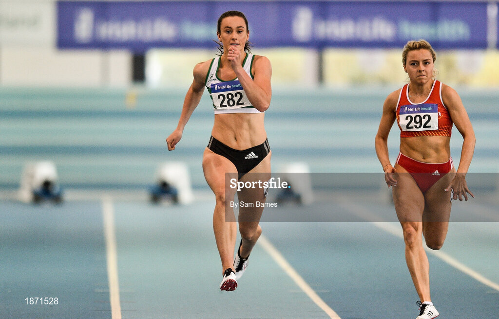 25 January 2020; Ciara Neville of Emerald A.C., Co. Limerick, left, on her way to winning the U23 Women's 60m, ahead of Sarah Quinn of St. Colmans South Mayo A.C., Co. Mayo, who finished fourth, during the Irish Life Health National Indoor Junior and U23 Championships at the AIT Indoor Arena in Athlone, Westmeath. Photo by Sam Barnes/Sportsfile