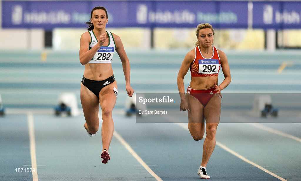 25 January 2020; Ciara Neville of Emerald A.C., Co. Limerick, left, on her way to winning the U23 Women's 60m, ahead of Sarah Quinn of St. Colmans South Mayo A.C., Co. Mayo, who finished fourth, during the Irish Life Health National Indoor Junior and U23 Championships at the AIT Indoor Arena in Athlone, Westmeath. Photo by Sam Barnes/Sportsfile