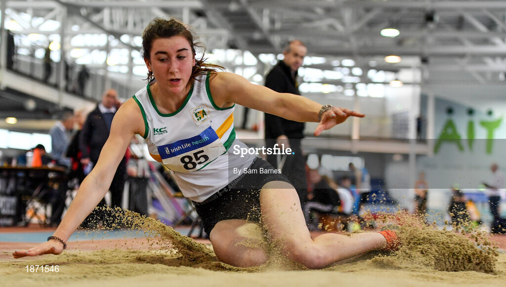 25 January 2020; Ruby Millet of St. Abbans A.C., Co. Carlow, competing in the Junior Women's Long Jump during the Irish Life Health National Indoor Junior and U23 Championships at the AIT Indoor Arena in Athlone, Westmeath. Photo by Sam Barnes/Sportsfile