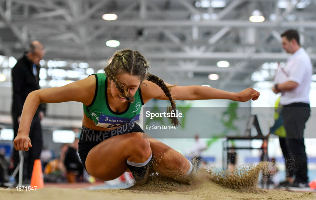 25 January 2020; Katie Nolke of Ferrybank A.C., Co. Waterford, competing in the Junior Women's Long Jump during the Irish Life Health National Indoor Junior and U23 Championships at the AIT Indoor Arena in Athlone, Westmeath. Photo by Sam Barnes/Sportsfile