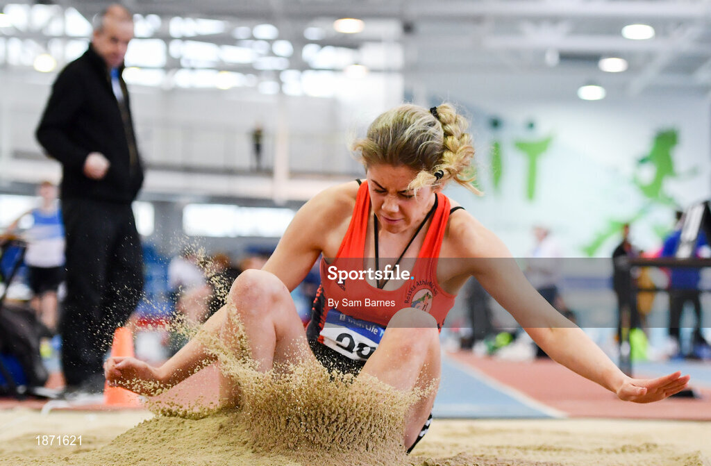 25 January 2020; Fodhla Nicpháidín of Rosses A.C., Co. Donegal, competing in the U23 Women's Long Jump during the Irish Life Health National Indoor Junior and U23 Championships at the AIT Indoor Arena in Athlone, Westmeath. Photo by Sam Barnes/Sportsfile