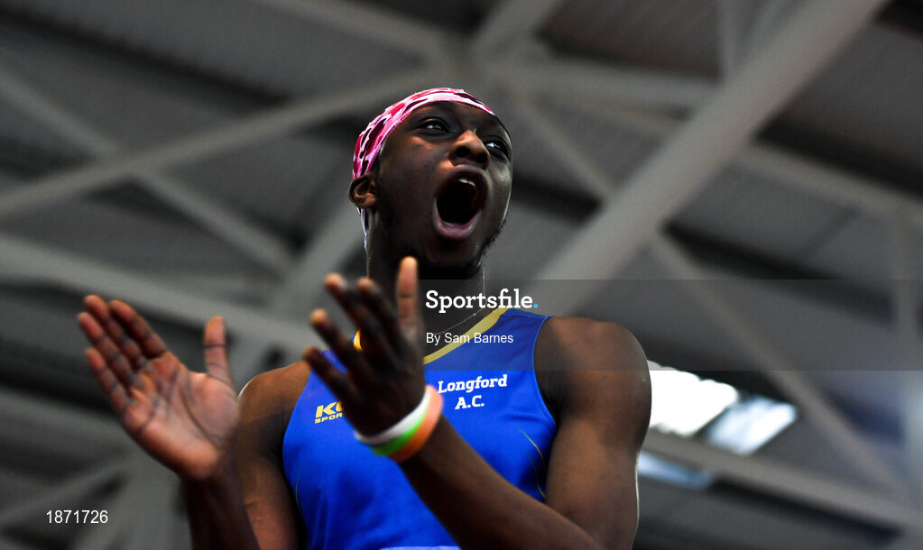 25 January 2020; Nelvin Appiah of Longford A.C., Co. Longford, celebrates a clearance whilst competing in the Junior Men's High Jump during the Irish Life Health National Indoor Junior and U23 Championships at the AIT Indoor Arena in Athlone, Westmeath. Photo by Sam Barnes/Sportsfile