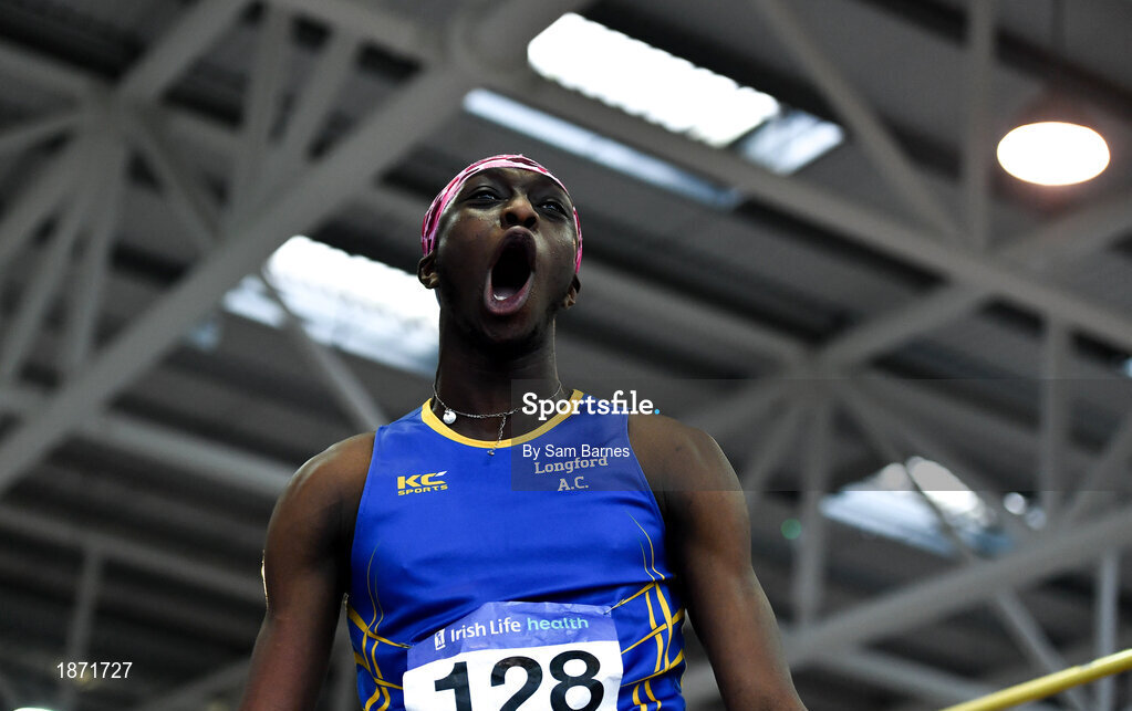25 January 2020; Nelvin Appiah of Longford A.C., Co. Longford, celebrates a clearance whilst competing in the Junior Men's High Jump during the Irish Life Health National Indoor Junior and U23 Championships at the AIT Indoor Arena in Athlone, Westmeath. Photo by Sam Barnes/Sportsfile