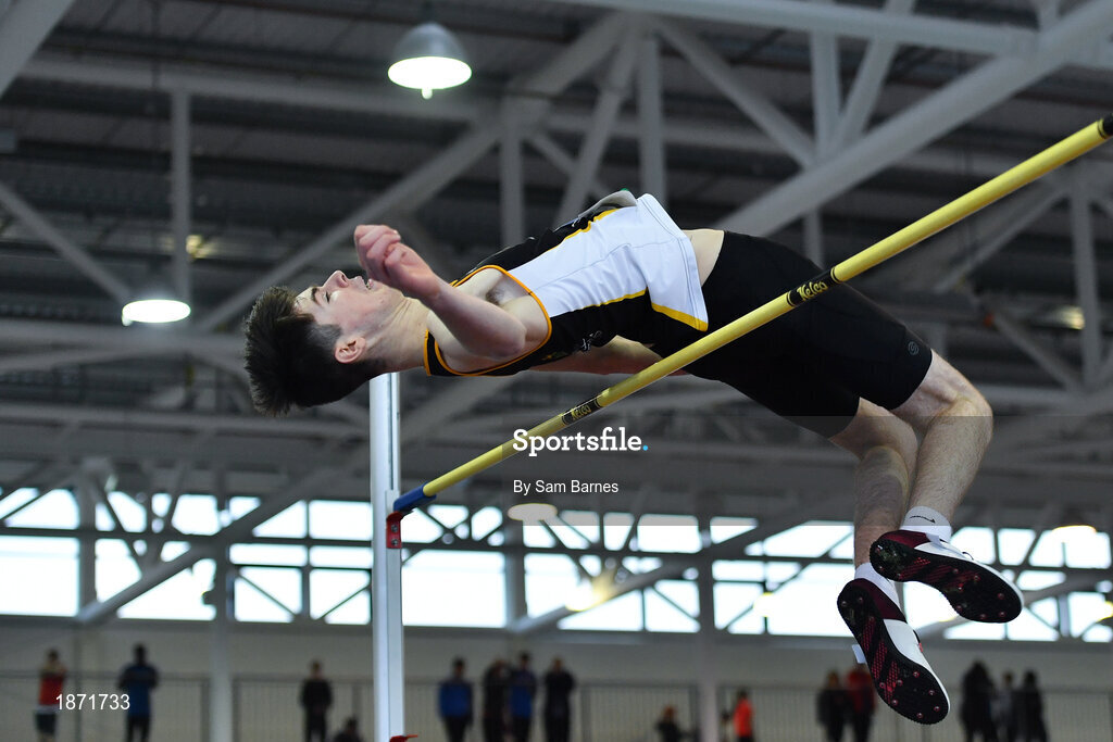 25 January 2020; Geoffrey Joy O'Regan of Sun Hill Harriers A.C., Co. Limerick, competing in the Junior Men's High Jump during the Irish Life Health National Indoor Junior and U23 Championships at the AIT Indoor Arena in Athlone, Westmeath. Photo by Sam Barnes/Sportsfile