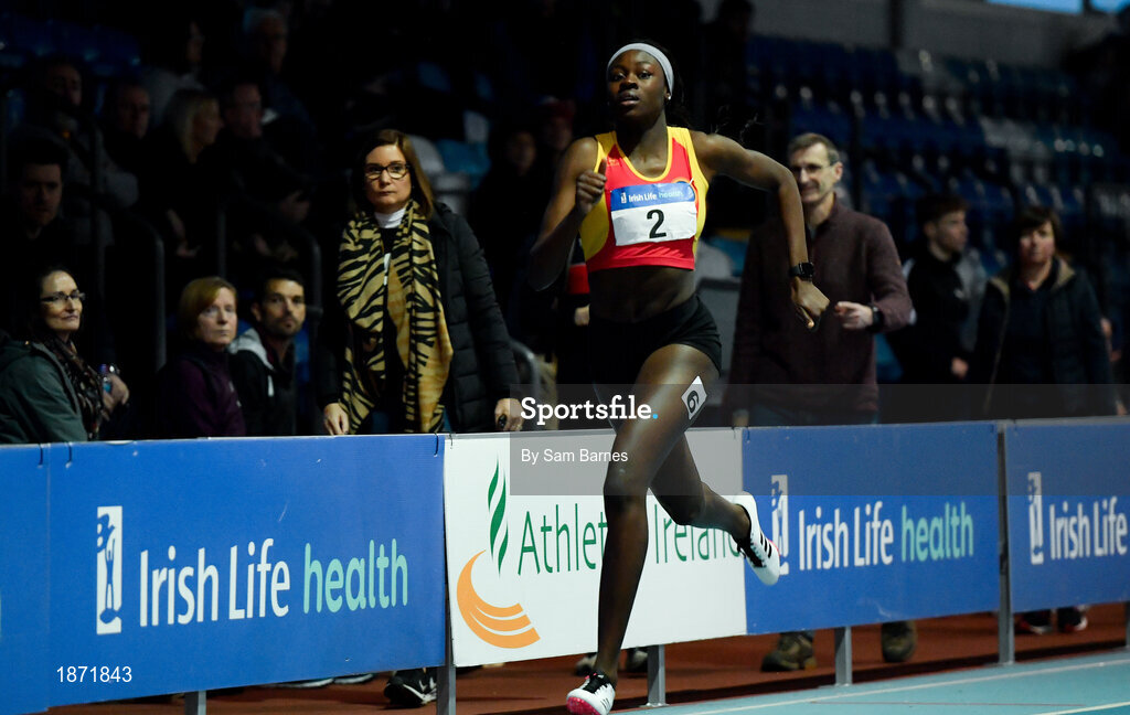 25 January 2020; Rhasidat Adeleke of Tallaght A.C., Dublin, on her way to winning the Junior Women's 200m during the Irish Life Health National Indoor Junior and U23 Championships at the AIT Indoor Arena in Athlone, Westmeath. Photo by Sam Barnes/Sportsfile