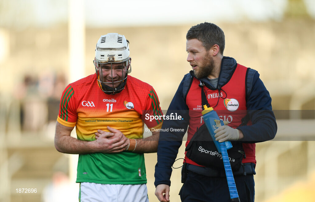 26 January 2020; Martin Kavanagh of Carlow, alongside physio Paul Kelly, leaves the field after picking up an injury during the Allianz Hurling League Division 1 Group B Round 1 match between Clare and Carlow at Cusack Park in Ennis, Clare. Photo by Diarmuid Greene/Sportsfile
