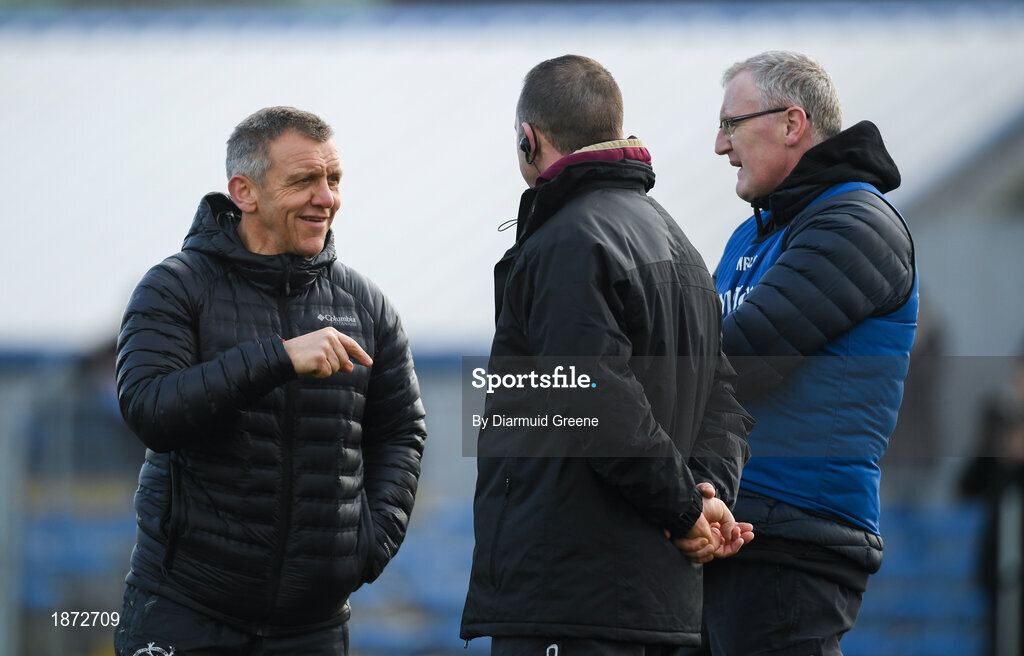 26 January 2020; Munster Rugby Elite Player Development Officer Greig Oliver, left, with Clare selector James Moran and manager Brian Lohan prior to the Allianz Hurling League Division 1 Group B Round 1 match between Clare and Carlow at Cusack Park in Ennis, Clare. Photo by Diarmuid Greene/Sportsfile