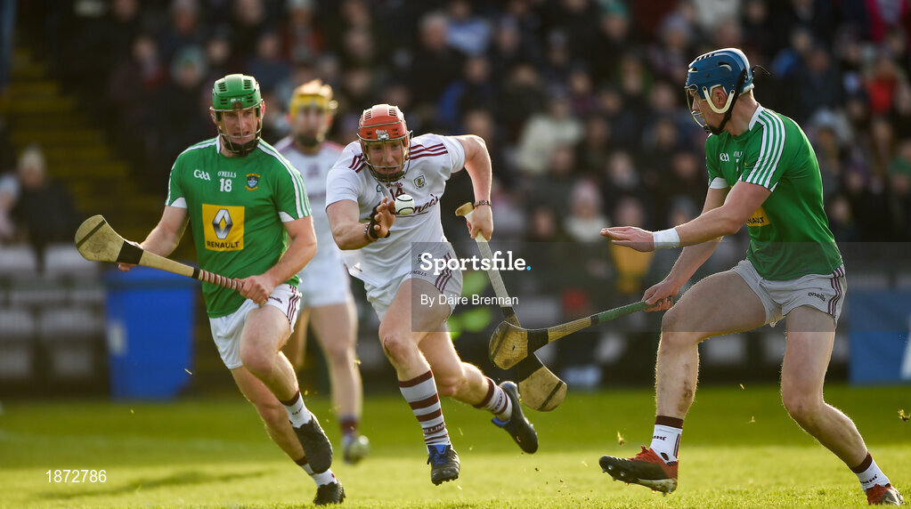 26 January 2020; Conor Whelan of Galway in action against John Gilligan, left, and Tommy Doyle of Westmeath during the Allianz Hurling League Division 1 Group A Round 1 match between Galway and Westmeath at Pearse Stadium in Galway. Photo by Daire Brennan/Sportsfile