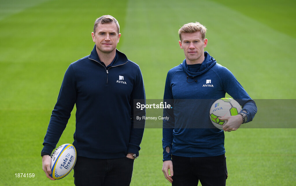 28 January 2020; Irish rugby legend Jamie Heaslip, left, and soccer star James McClean at the unveiling of Aviva’s new Sensory Hub in Aviva Stadium. Aviva, Ireland’s largest insurer, and proud sponsors of the home of Irish rugby and soccer launched the initiative to make Aviva Stadium a more inclusive space for people with additional sensory needs. The state-of-the-art sensory booth is free for any fan to use during their visit to Aviva Stadium. For more information follow Aviva on Instagram, Twitter, and Facebook or visit www.aviva.ie/sponsorship. Photo by Ramsey Cardy/Sportsfile