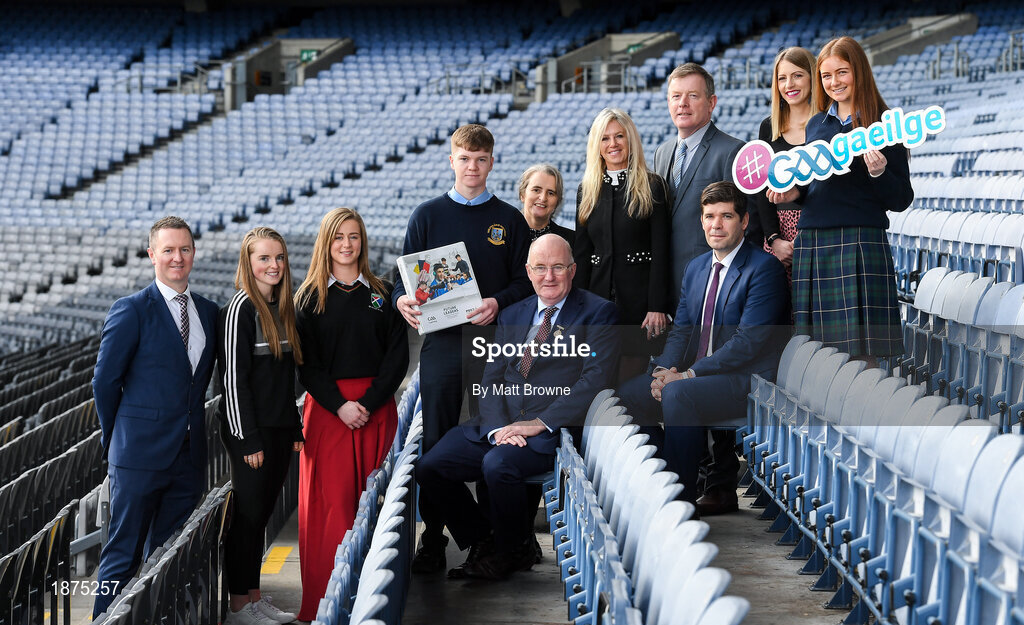 30 January 2020; Uachtarán Chumann Lúthchleas Gael Seán Ó hÓráin, with, from left, Eoghan Hanley, Naomi Ní Chearbhaill, Emma Ní Chinnèide, Dónall Ó Cinnéide, Lís Ní Dhálaigh, Ciara O Donnell, Dónal Ó hAiniféin, former Kerry manager Eamonn Fitzmaurice, Máire Treasa Ní Dhubhghaill agus Lilí Ní Bhrádaigh during the GAA / PDST Future Leaders Leagan Gaeilge launch at Croke Park in Dublin. Photo by Matt Browne/Sportsfile