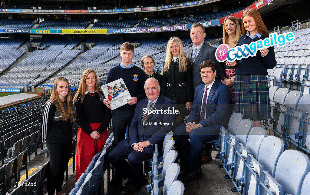 30 January 2020; Uachtarán Chumann Lúthchleas Gael Seán Ó hÓráin, with, from left, Naomi Ní Chearbhaill, Emma Ní Chinnèide, Dónall Ó Cinnéide, Lís Ní Dhálaigh, Ciara O Donnell, Dónal Ó hAiniféin, former Kerry manager Eamonn Fitzmaurice, Máire Treasa Ní Dhubhghaill agus Lilí Ní Bhrádaigh during the GAA / PDST Future Leaders Leagan Gaeilge launch at Croke Park in Dublin. Photo by Matt Browne/Sportsfile