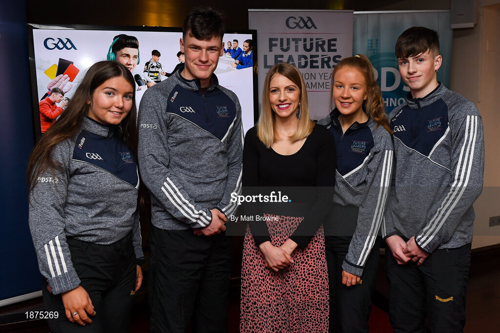 30 January 2020; Máire Treasa Ní Dhubhghaill, Sports Presenter, TG4, with, from left, Róisín Ní Chonghaile, Éanna Ó Curraoin, Kianna Ní Mhárta, Tomás Ó Curraoin, from Colaiste Cholmcille, Gaillimh, during the GAA / PDST Future Leaders Leagan Gaeilge launch at Croke Park in Dublin. Photo by Matt Browne/Sportsfile