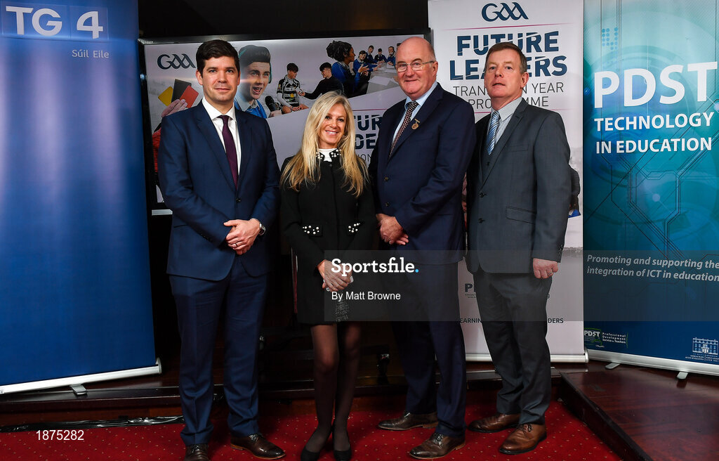 30 January 2020; Uachtarán Chumann Lúthchleas Gael Seán Ó hÓráin, with, from left, former Kerry manager Eamonn Fitzmaurice, Ciara O Donnell, PDST, agus Dónal Ó hAiniféin, Cathaoirleach COGG, during the GAA / PDST Future Leaders Leagan Gaeilge launch at Croke Park in Dublin. Photo by Matt Browne/Sportsfile