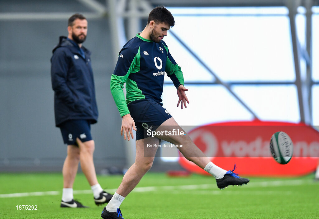 30 January 2020; Harry Byrne, watched by head coach Andy Farrell, during Ireland Rugby squad training at the IRFU High Performance Centre in Abbotstown, Dublin. Photo by Brendan Moran/Sportsfile
