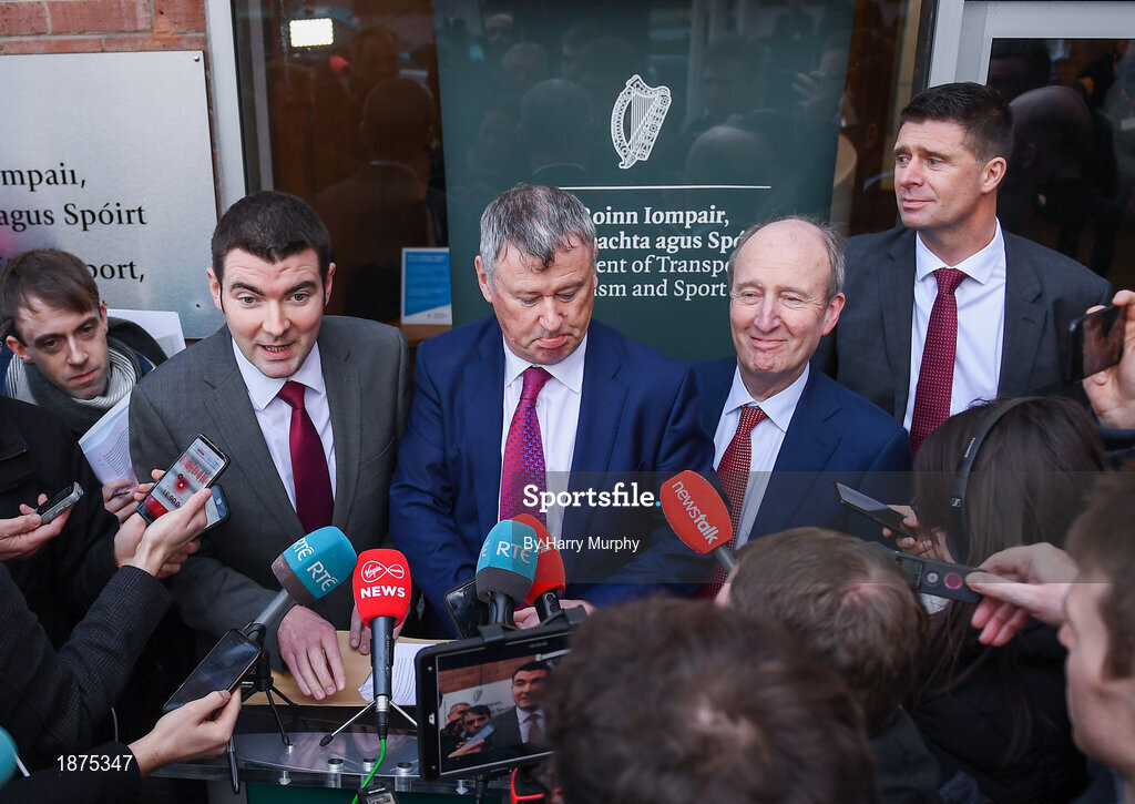 30 January 2020; Minister of State for Tourism and Sport Brendan Griffin TD, left, with from left to right, FAI Interim Chief Executive Gary Owens, Minister for Transport, Tourism and Sport, Shane Ross TD, and FAI Interim Deputy Chief Executive Niall Quinn following a Government Officials, FAI, UEFA and Bank of Ireland meeting at the Department of Transport, Tourism and Sport in Dublin. Photo by Harry Murphy/Sportsfile