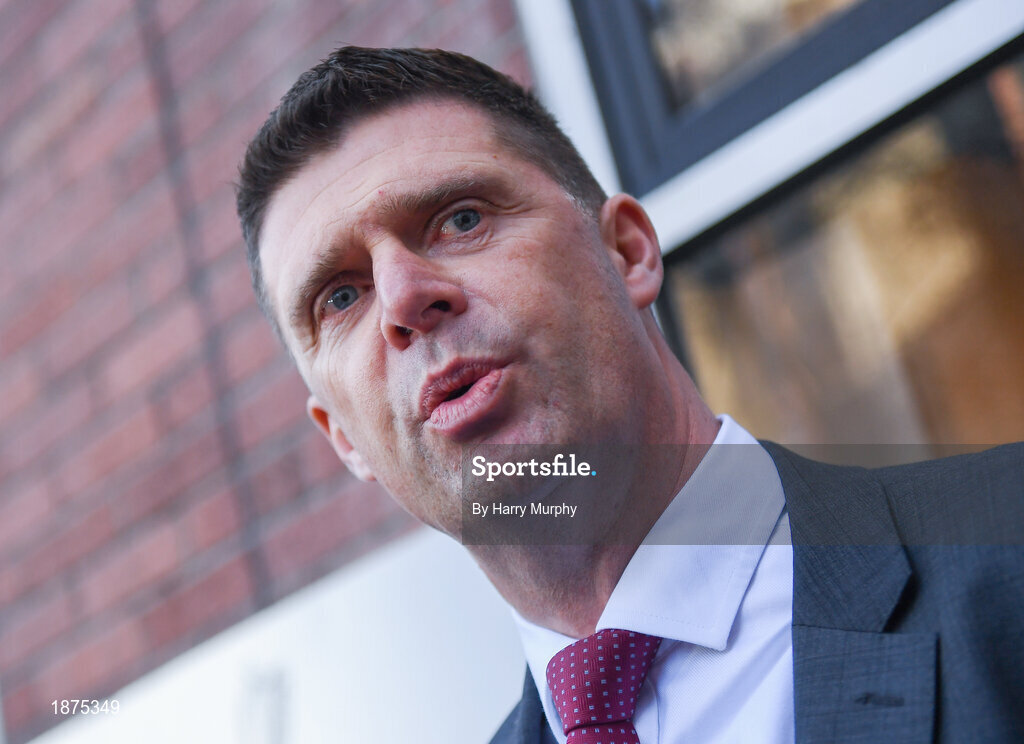 30 January 2020; FAI Interim Deputy Chief Executive Niall Quinn speaks following a Government Officials, FAI, UEFA and Bank of Ireland meeting at the Department of Transport, Tourism and Sport in Dublin. Photo by Harry Murphy/Sportsfile