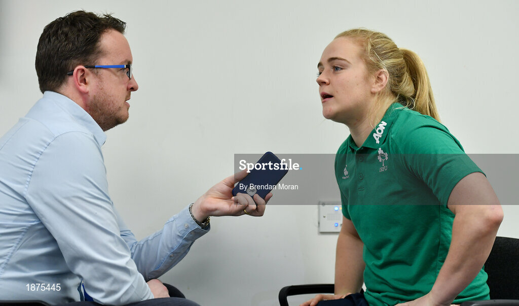 30 January 2020; Cliodhna Moloney is interviewed by RTE journalist Damien O'Meary during an Ireland Women's Rugby press conference at the IRFU High Performance Centre in Abbotstown, Dublin. Photo by Brendan Moran/Sportsfile