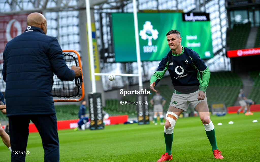 31 January 2020; Jonathan Sexton and masseur Mike Thompson during the Ireland Rugby captain's run at the Aviva Stadium in Dublin. Photo by Ramsey Cardy/Sportsfile