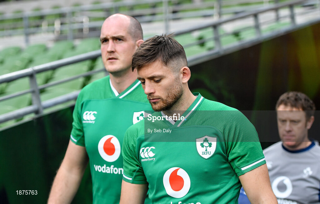 31 January 2020; Ross Byrne, right, and Devin Toner during an Ireland Rugby captain's run at the Aviva Stadium in Dublin. Photo by Seb Daly/Sportsfile