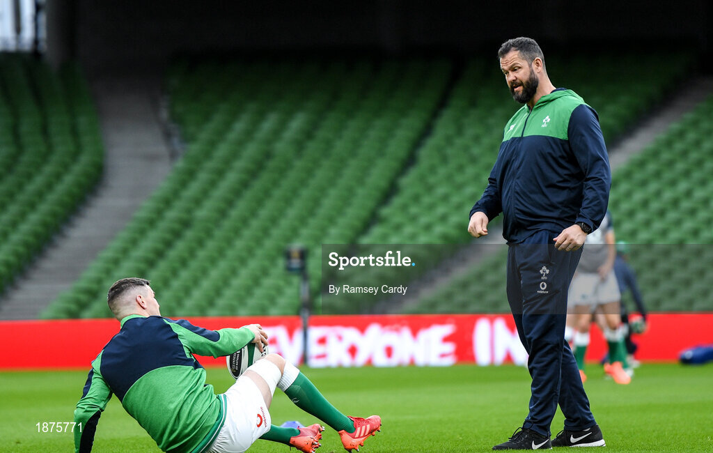 31 January 2020; Captain Jonathan Sexton, left, in conversation with head coach Andy Farrell during the Ireland Rugby captain's run at the Aviva Stadium in Dublin. Photo by Ramsey Cardy/Sportsfile
