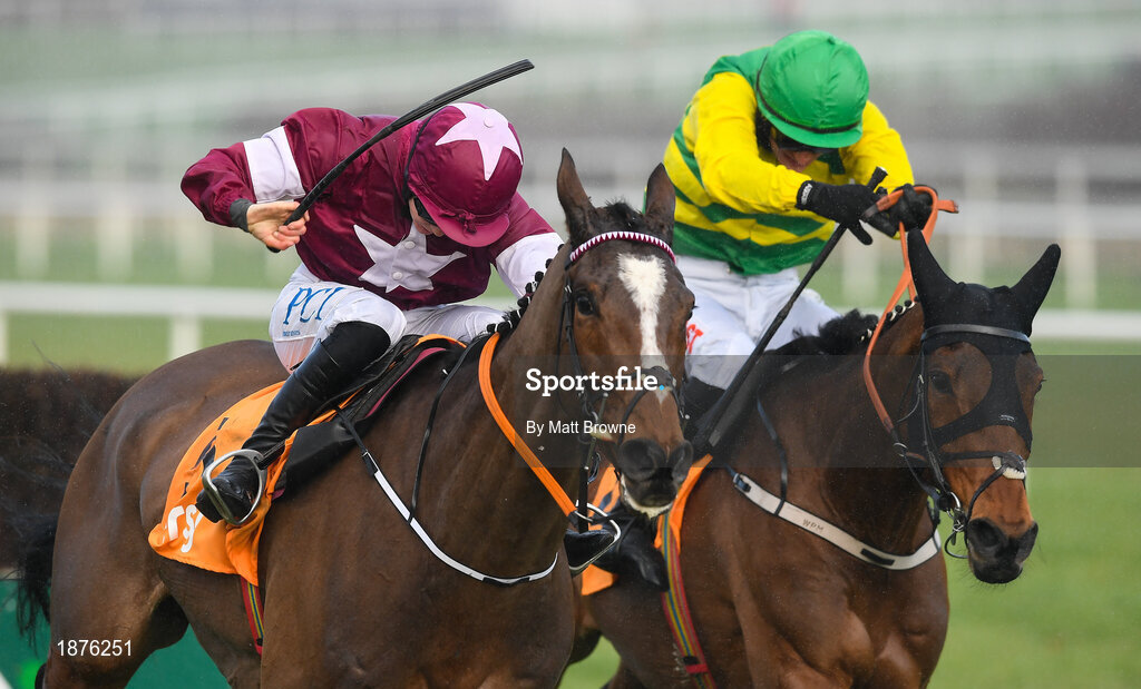 1 February 2020; Notebook with Rachael Blackmore up, left, on their way to winning The ERSG Arkle Novice Steeplechase from second place Cash Back, with Danny Mullins up, during Day One of the Dublin Racing Festival at Leopardstown Racecourse in Dublin. Photo by Matt Browne/Sportsfile