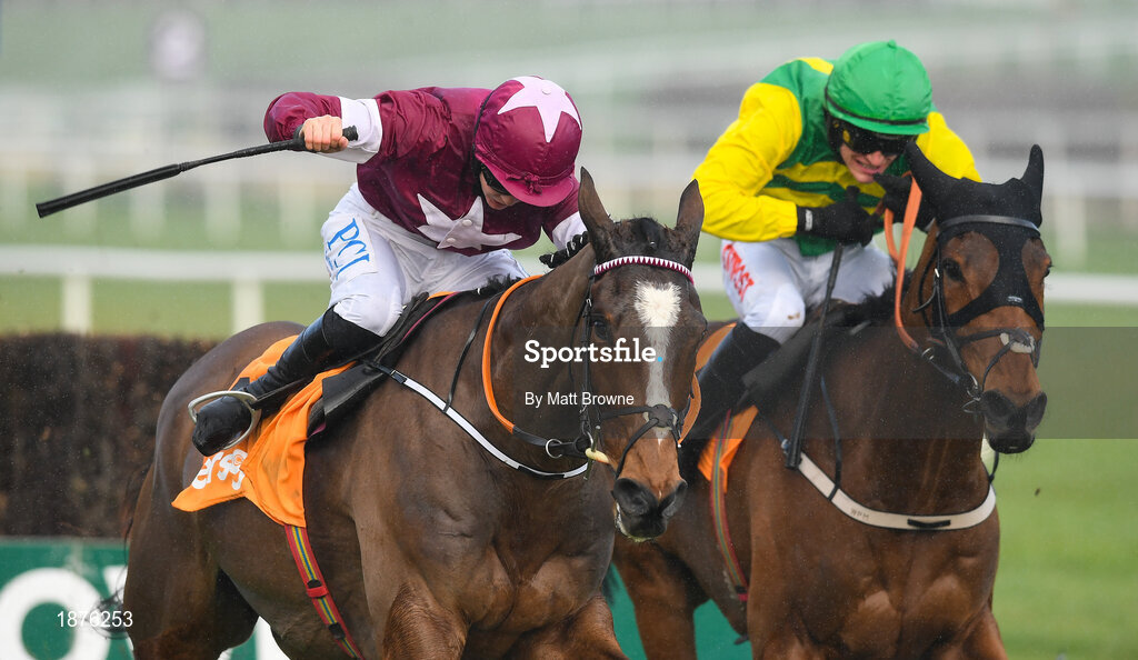 1 February 2020; Notebook with Rachael Blackmore up, left, on their way to winning The ERSG Arkle Novice Steeplechase from second place Cash Back, with Danny Mullins up, after jumping the last during Day One of the Dublin Racing Festival at Leopardstown Racecourse in Dublin. Photo by Matt Browne/Sportsfile