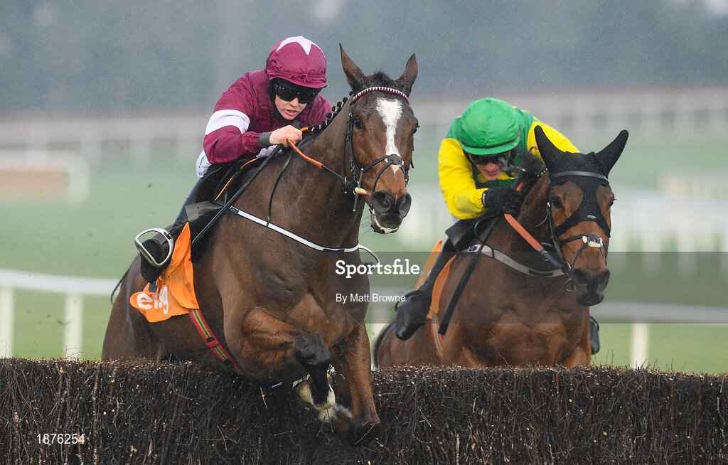 1 February 2020; Notebook, with Rachael Blackmore up, left, jumps the last on their way to winning The ERSG Arkle Novice Steeplechase from second place Cash Back, with Danny Mullins up, during Day One of the Dublin Racing Festival at Leopardstown Racecourse in Dublin. Photo by Matt Browne/Sportsfile