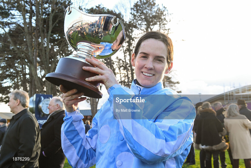 1 February 2020; Jockey Rachael Blackmore with the cup after winning the PCI Irish Champion Hurdle on Honeysuckle during Day One of the Dublin Racing Festival at Leopardstown Racecourse in Dublin. Photo by Matt Browne/Sportsfile