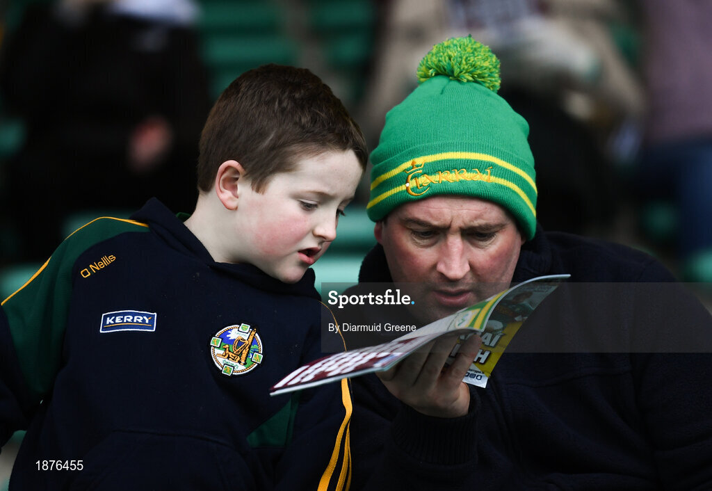 1 February 2020; Conor Dalton, aged 7, reads the match programme with his father Charles Dalton, from Asdee, Co. Kerry prior to the Allianz Football League Division 1 Round 2 match between Kerry and Galway at Austin Stack Park in Tralee, Kerry. Photo by Diarmuid Greene/Sportsfile