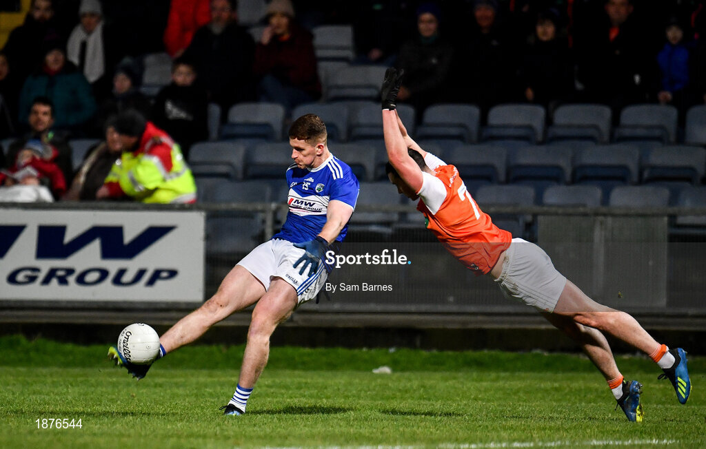 1 February 2020; Evan O’Carroll of Laois kicks to score a point despite the efforts of Aaron McKay of Armagh during the Allianz Football League Division 2 Round 2 match between Laois and Armagh at MW Hire O'Moore Park in Portlaoise, Laois. Photo by Sam Barnes/Sportsfile