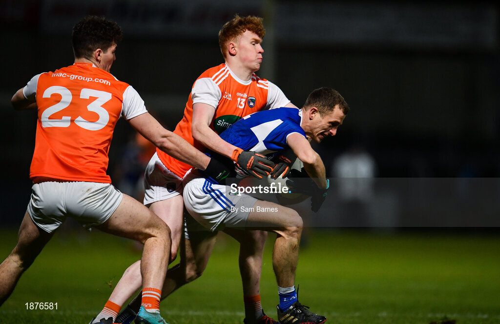 1 February 2020; Gearoid Hanrahan of Laois in action against Conor Turbitt, centre, and Jarlath Og Burns of Armagh during the Allianz Football League Division 2 Round 2 match between Laois and Armagh at MW Hire O'Moore Park in Portlaoise, Laois. Photo by Sam Barnes/Sportsfile